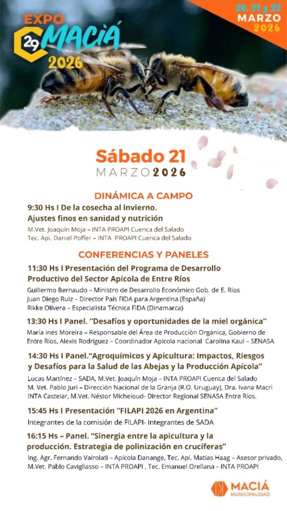 Especialistas del Fondo Internacional de Desarrollo Agrícola (FIDA), del Instituto Nacional de Tecnología Agropecuaria a través de PROAPI, del Servicio Nacional de Sanidad y Calidad Agroalimentaria y de la Sociedad Argentina de Apicultores compartirán escenario con productores y dirigentes. Maciá no solo celebra la miel: debate el presente, tensiona el modelo productivo y diseña el futuro de la apicultura.